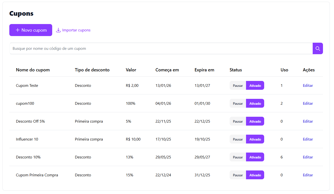 Com nossa plataforma, você tem total controle sobre seus <mark style="color:purple;">**cupons de desconto!**</mark> 💰✨ Defina valores fixos ou percentuais, limite o uso por cliente e escolha em quais canais estarão disponíveis: <mark style="color:purple;">**delivery, retirada em loja ou consumo no local**</mark>. Além disso, personalize a validade e os horários para criar promoções irresistíveis nos momentos certos.