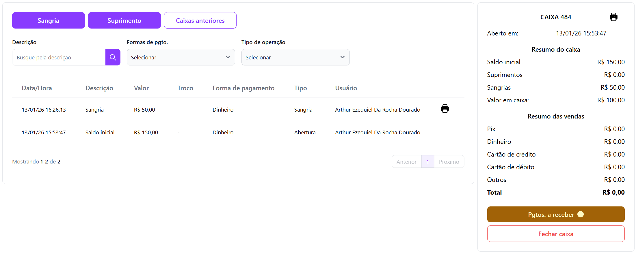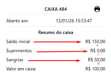 Mostra o valor atual disponível, considerando:\ <mark style="color:purple;">**Saldo inicial + Suprimentos − Sangrias**</mark>