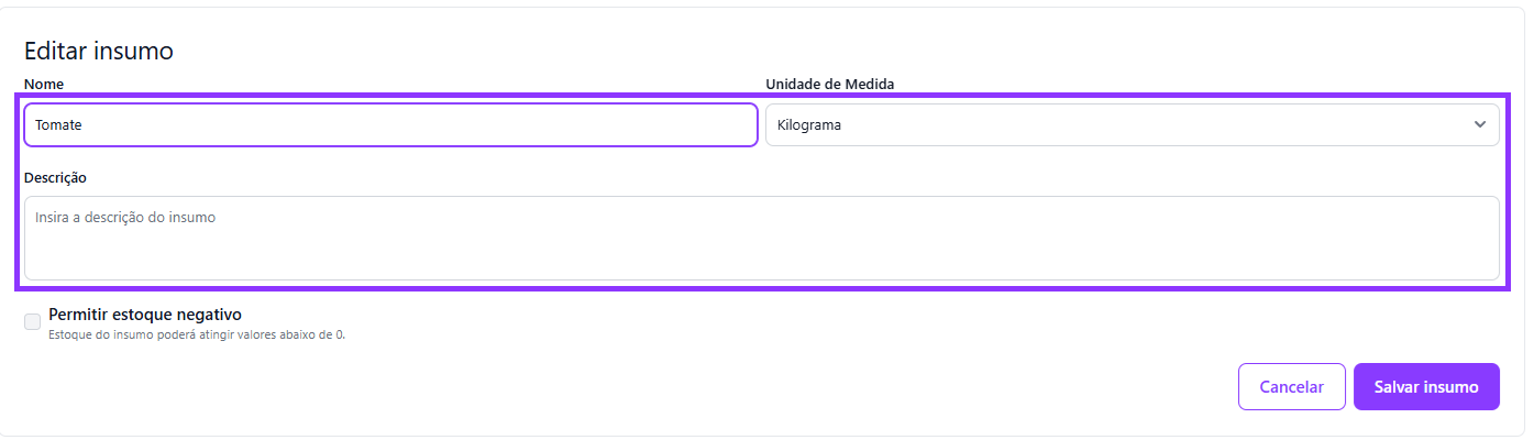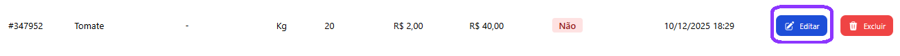 O botão Editar permite atualizar qualquer informação de um insumo já cadastrado.