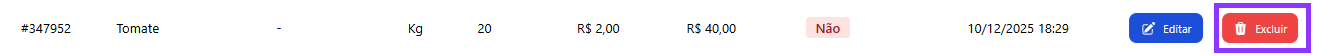 O botão **Excluir** remove definitivamente um ingrediente do estoque.