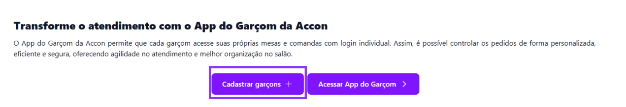 Clique no botão **Cadastrar garçons +** localizado no banner principal da seção.