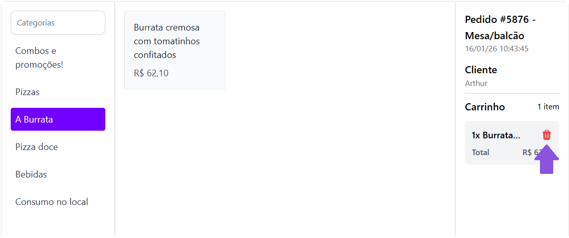 1️⃣ Clique no ícone de **lixeira** ao lado do produto.