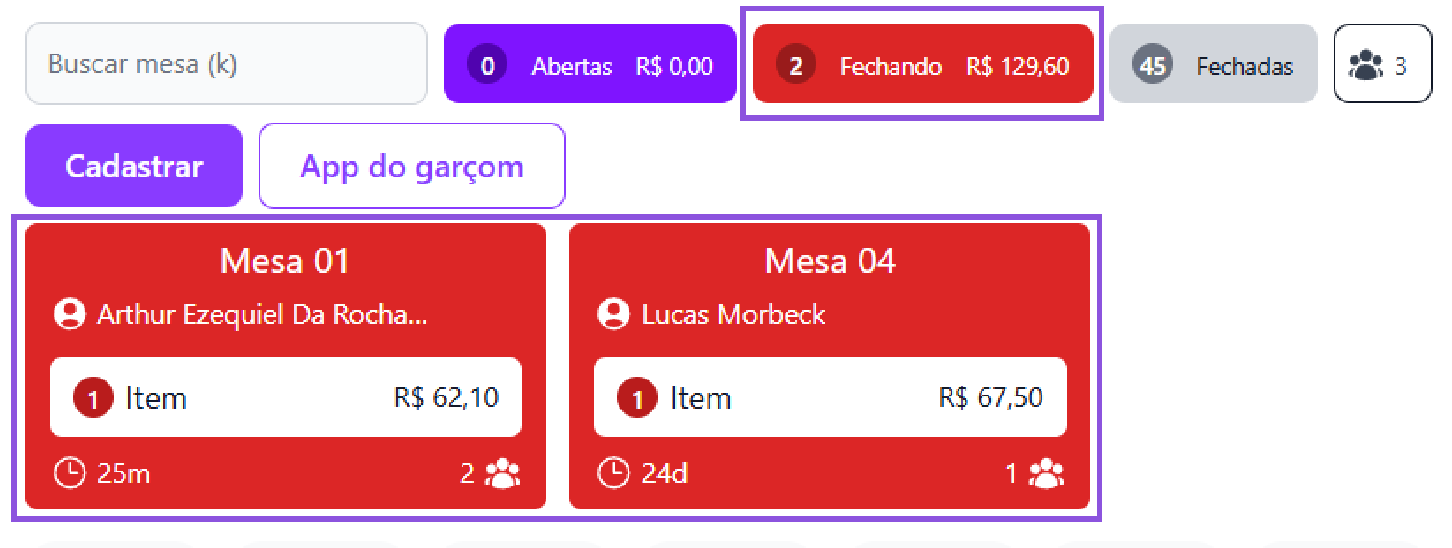 Localize a mesa ou comanda com status **“Fechando”**.