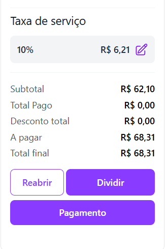 Enquanto não houver finalização do pagamento, é possível <mark style="color:purple;">**reabrir a conta**</mark> para fazer ajustes ou incluir novos itens.